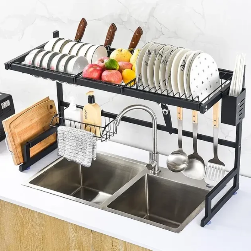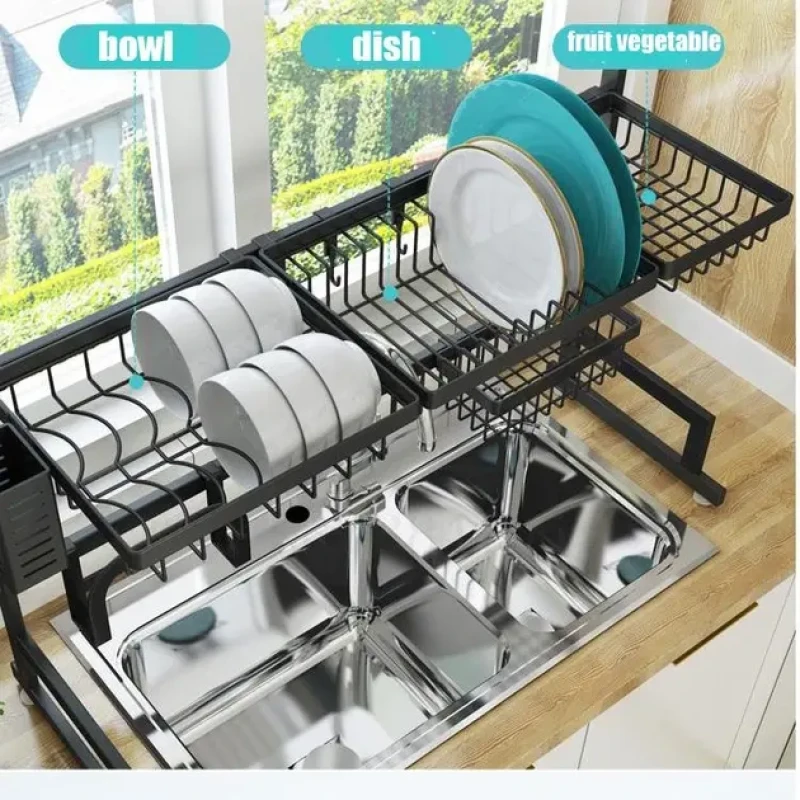 Ця двоярусна регульована полиця - органайзер відрізняється великою ємністю для зберігання різного кухонного приладдя та компактним дизайном для економії місця. Розміщуйте миски, тарілки, столові прилади та інше кухонне приладдя в окремих кошиках. За допомогою наших органайзерів зберігання посуду стане ефективнішим, а також організованішим. Крім того, ширину цієї полиці для сушіння посуду з нержавіючої сталі можна регулювати відповідно до розміру вашої раковини, що робить її придатною для більшості побутових раковин.