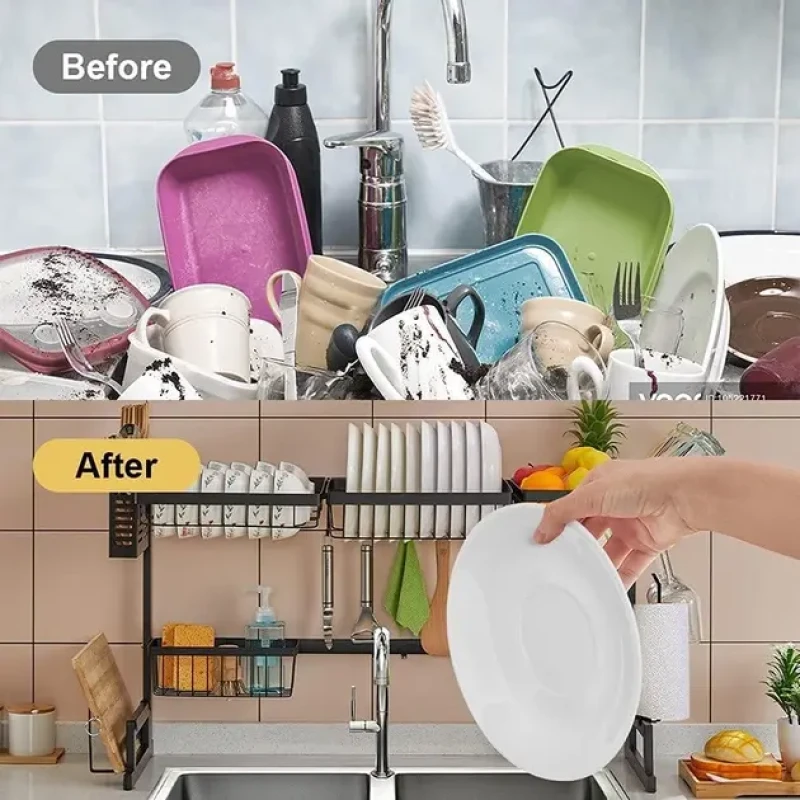 БАГАТОФУНКЦІОНАЛЬНА СУШИЛКА ДЛЯ КУХОННОГО ПОСУДУ - Полиця для сушіння посуду над раковиною забезпечує чистоту та легкість висихання всього посуду та столових приладів. Полиця для сушіння посуду вміщує багато речей, ви можете: поставити миску/тарілку або овочі/фрукти у стійку, взяти кухонний ніж/обробну дошку/кухоль/ложку або поставити миючий засіб у тримач або повісити лопатку/серветку для посуду на гачок. Найкращий кухонний органайзер для зберігання та економії місця не тільки для великої кухні, але й для маленької кухні.