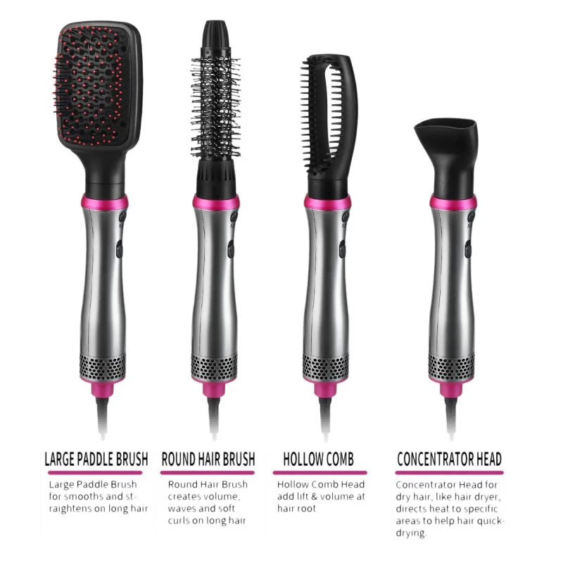 Прекрасний гребінь для укладання волосся і гребінець для укладання волосся: його можна використовувати як об'ємну праску для вологого волосся. Це також гребінець для укладання волосся з 5 різними щітками з гарячим повітрям. Легко розбирати та встановлювати щітки.