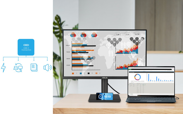 ASUS VA27UCPS - 27-дюймовий HDR-монітор з роздільною здатністю 4K (3840 x 2160), оснащений безрамковою IPS-панеллю з широким кутом огляду, що забезпечує неймовірно чітке зображення та чудове відтворення відео. Вбудований порт USB-C підтримує передачу даних, відеосигналу та живлення потужністю 65 Вт через один кабель - зручне рішення. Високоергономічний дизайн з регулюванням нахилу, повороту, обертання та висоти, а також сертифікована TÜV Rheinland технологія без мерехтіння та низький рівень синього світла забезпечують комфортний перегляд.