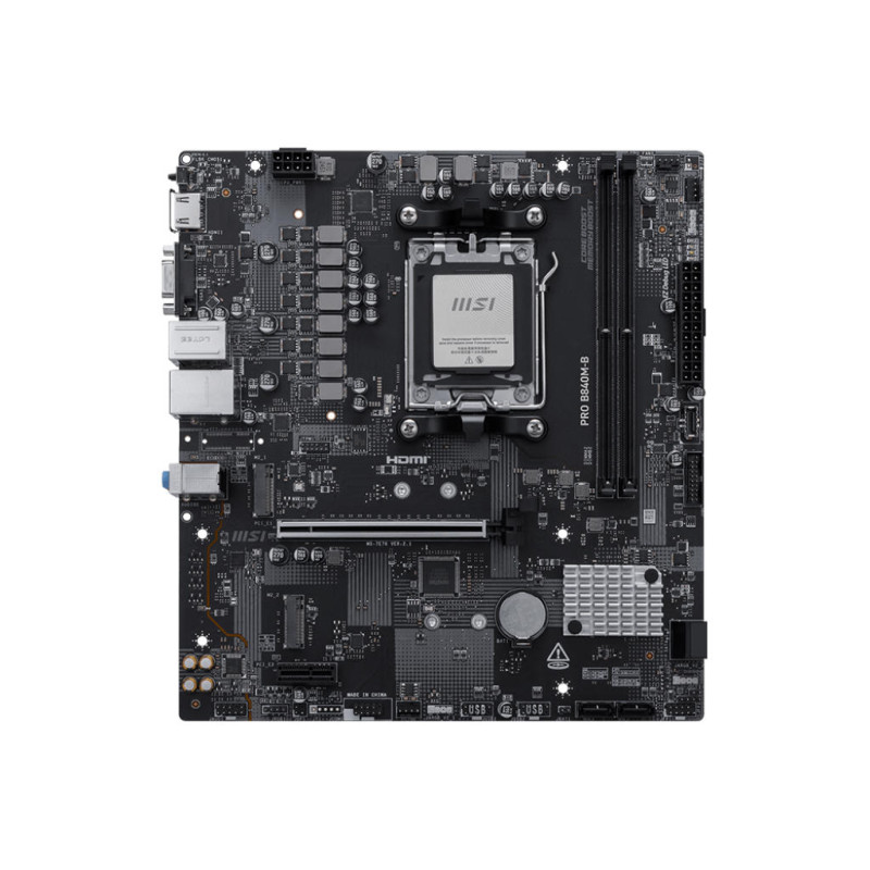 MSI PRO B840M-B – це материнська плата формату mATX на базі чіпсету AMD B840, створена для сучасних процесорів Ryzen серій 9000, 8000 та 7000. Вона підтримує DDR5 до 128 ГБ, оснащена двома слотами M.2 PGe та зручним механізмом EZ PCIe Clip II для швидкого встановлення відеокарти.