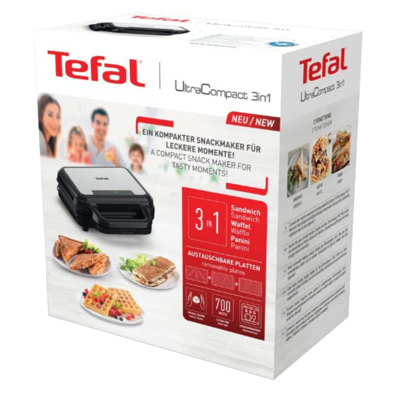 З мультимейкером UltraCompact 3в1 SW383D10 від Tefal насолоджуйтесь смачними закусками щодня. Цей багатофункціональний прилад поєднує у собі вафельницю, сендвічницю та прес для паніні – абсолютна універсальність і різноманітність смачних закусок, які сподобаються кожному!