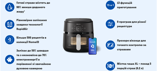 Мультипіч Philips Ovi стане майстром з ідеального запікання завдяки технології RapidAir з унікальним дизайном «starfish» (морська зірка). Забезпечуючи ще більш вільну і швидку циркуляцію повітря всередині чаші, вона зробить всі ваші страви неймовірно смачними, подарує золотисту скоринку і збереже їх приголомшливо соковитими, практично без додавання олії. Будьте впевнені в кращих результатах приготування та збереженні всіх поживних властивостей, коли готуєте курку, улюблену картоплю фрі або стейки.