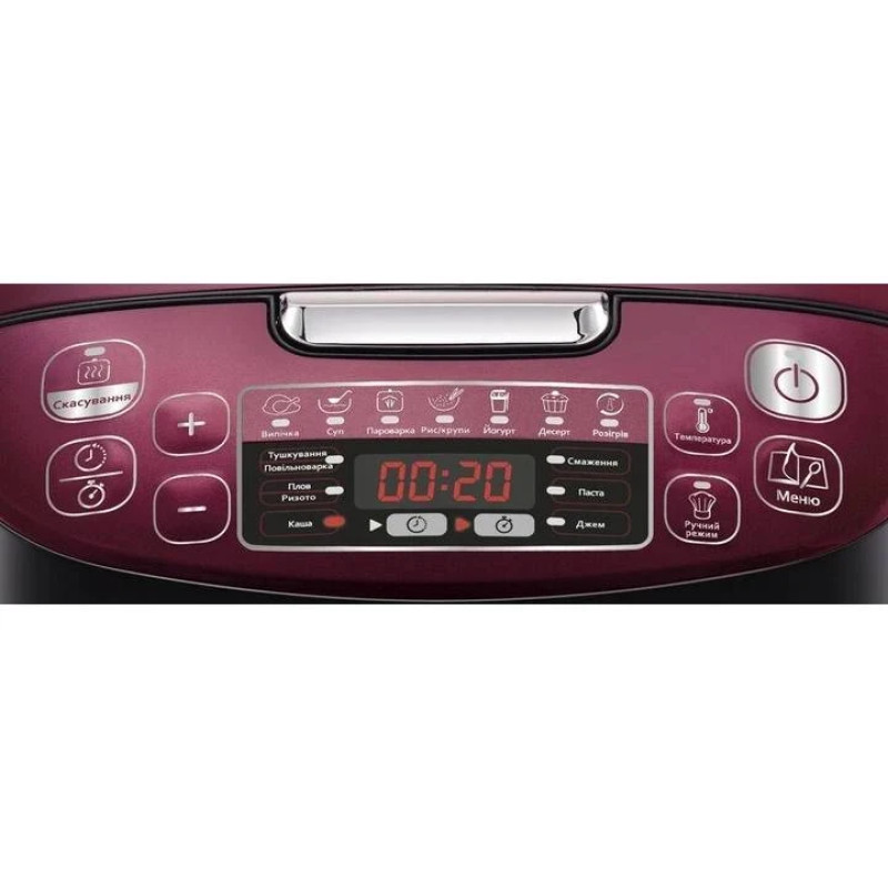 Унікальний зовнішній вигляд мультиварки порадує естетів. Корпус бордового кольору в поєднанні з текстурованими бортами у вигляді дорогоцінних каменів виглядає дуже привабливо, при цьому легко чиститься за рахунок гладкої поверхні пластика.