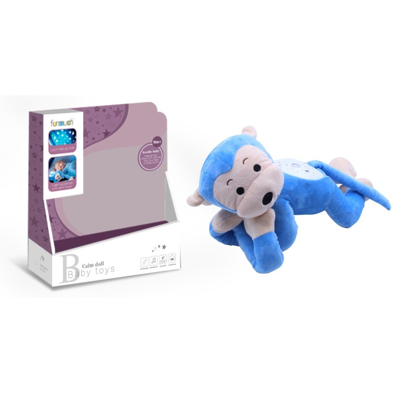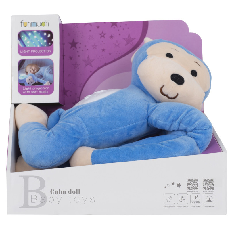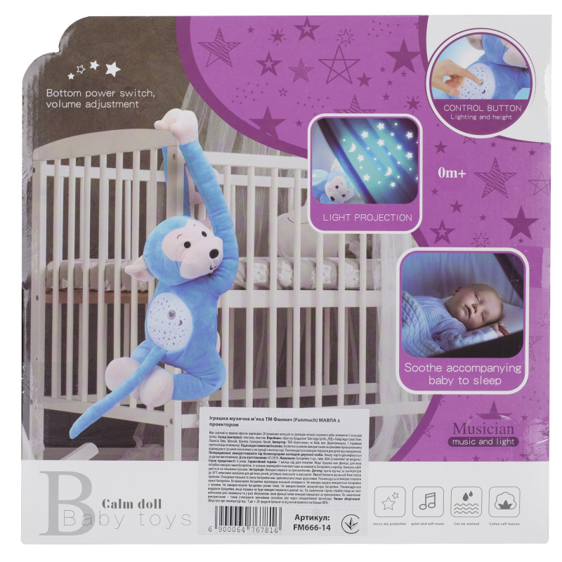 М'яка музична іграшка з проектором МАВПА ТМ Funmuch. Має світлові та звукові ефекти: відтворює 20 приємних мелодій і проекцію нічного зоряного неба змінюючи 5 кольорів світла. Іграшка безперервно працює протягом 20 хвилин. Можна прати, попередньо вийнявши музичний блок. Живлення: 3 батарейки типу AAA (в комплект не входять). Матеріал: текстиль, пластик. Підходить для дітей від 0 місяців (від народження).