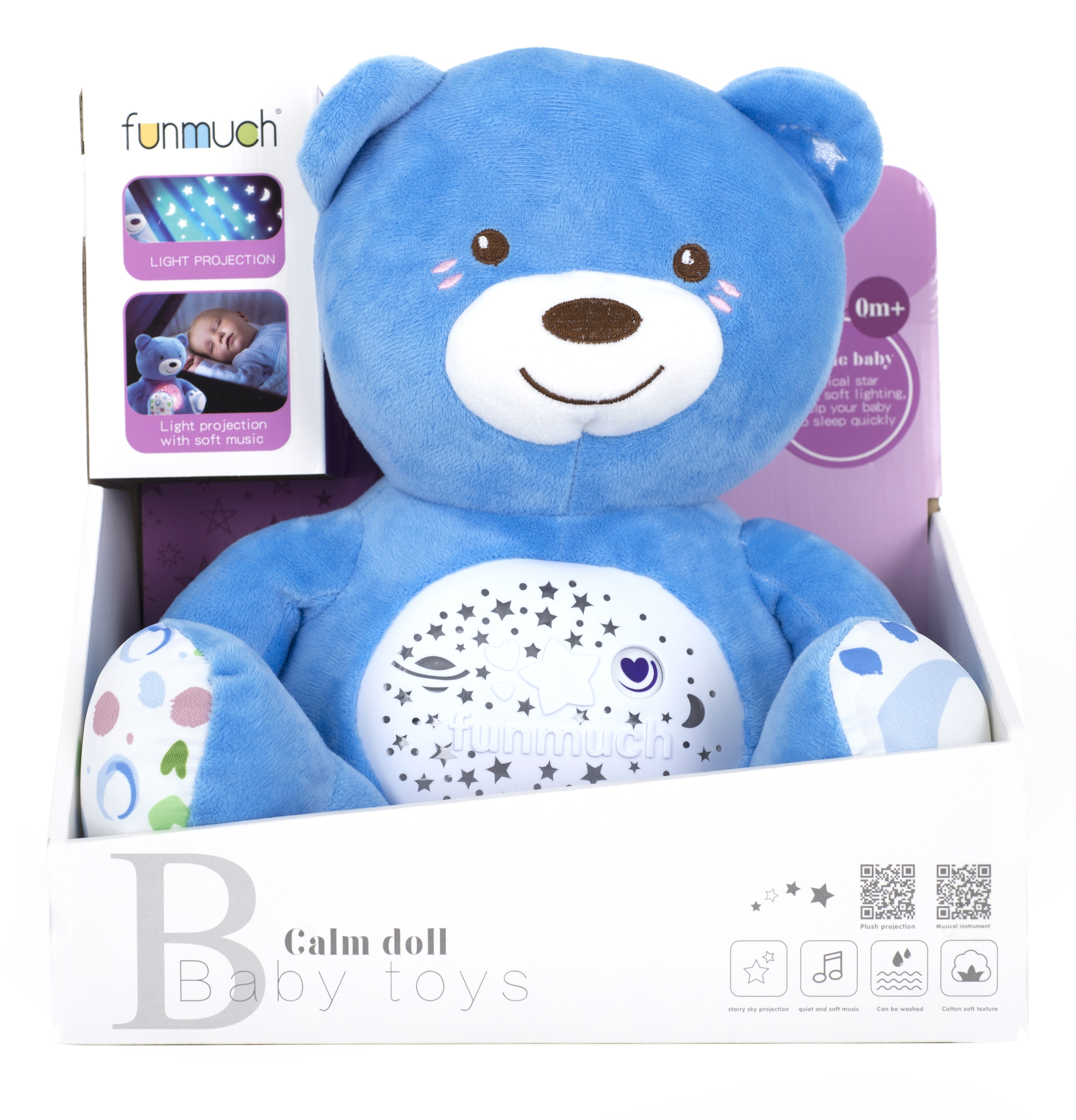 М'яка музична іграшка з проектором ВЕДМЕДИК ТМ Funmuch. Має світлові та звукові ефекти: відтворює 20 приємних мелодій і проекцію нічного зоряного неба змінюючи 5 кольорів світла. Іграшка безперервно працює протягом 20 хвилин. Можна прати, попередньо вийнявши музичний блок. Живлення: 3 батарейки типу AAA (в комплект не входять). Матеріал: текстиль, пластик. Підходить для дітей від 0 місяців (від народження). Розмір іграшки: 41х37х17 см. Упаковка: відкрита коробка 27х18х28 см.