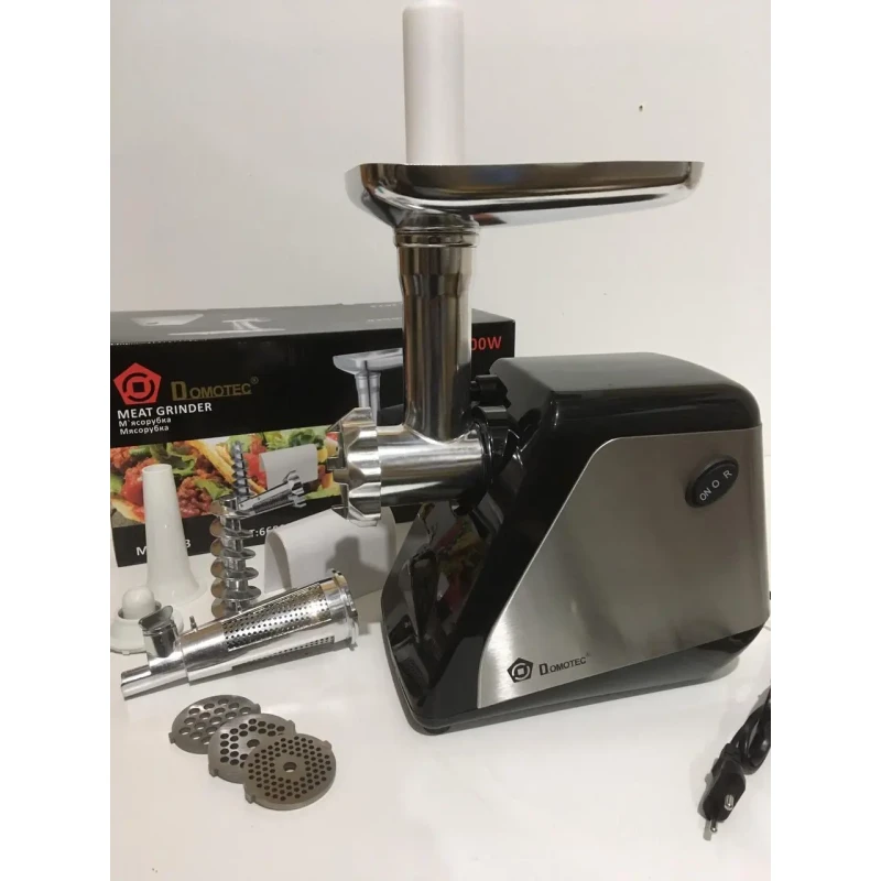 Перед вами не просто м'ясорубка, а багатофункціональний, компактний, високоефективний і надійний помічник на кухні. Бургери, ковбаски, домашні сосиски - все це чаклунство Вам запросто накрутить наша м'ясорубка DOMOTEC MS-2023 вона готова взятися за найскладніші завдання: подрібнити, прокрутити і перетворити м'ясо в ніжний фарш. М'ясорубка має класичний дизайн, який чудово буде виглядати в будь-якому інтер'єрі. Потужність приладу складає 3000 Вт. Модель DOMOTEC MS-2023 має декілька корисних функцій: Захист від перегріву- система двигуна буде сама контролювати свою роботу і попереджати можливе навантаження або перегрів, що забезпечує довговічність приладу та мінімізацію його поломки. Реверс - дана функція значно полегшує подрібнення м'яса і приготування фаршу, знижує навантаження на насадки, ножі і навіть двигун. Крім цього, реверс полегшує процес догляду за м'ясорубкою. Ваш прилад працюватиме набагато ефективніше, довше та м'якше, підтверджуючи свою зносостійкість. М'ясорубка обладнана всіма необхідними насадками та комплектуючими, а саме: 3 грати для фаршу, насадка для ковбас, насадка для кеббе, а також насадка для томатів.