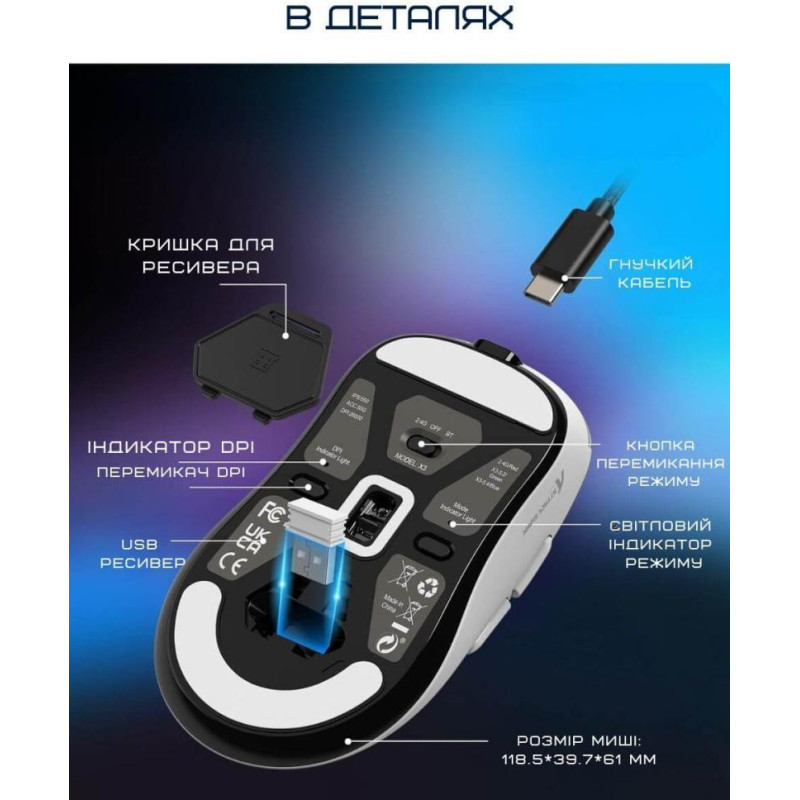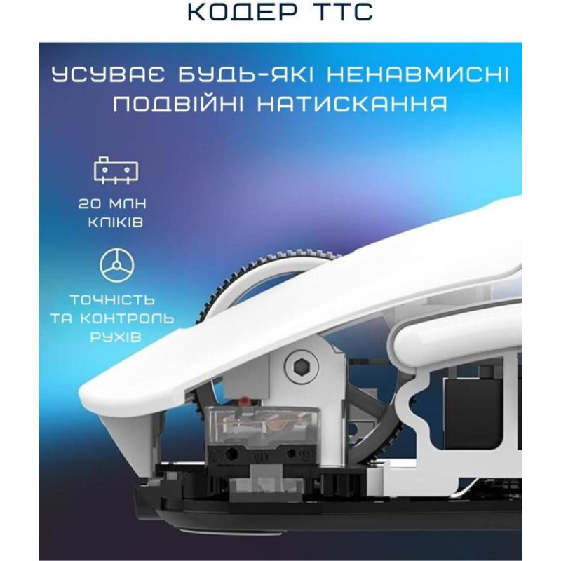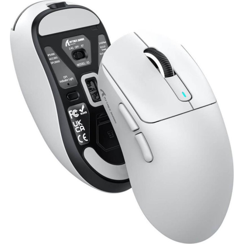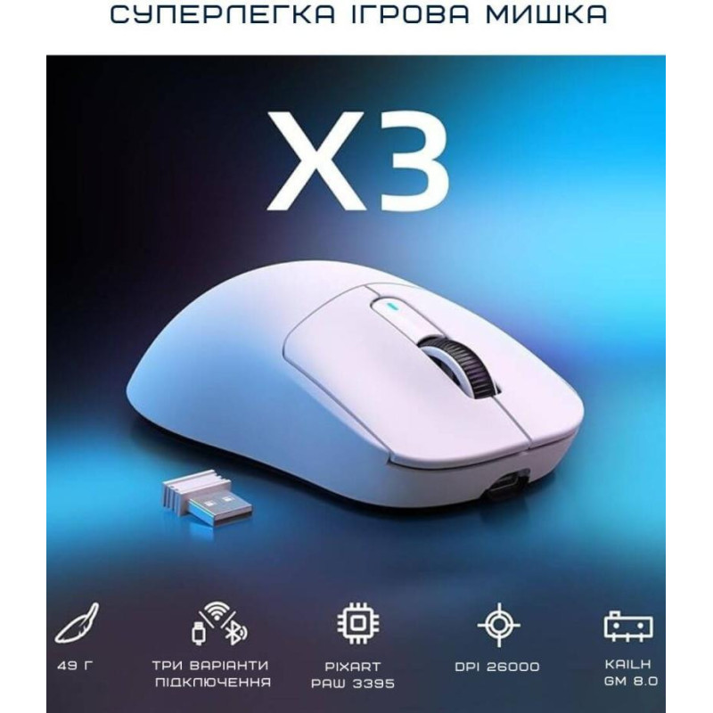 Ігрова миша ATTACK SHARK X3 White - це універсальний пристрій, що підходить для роботи та ігор, з можливістю проводового та бездротового підключення. Підключення здійснюється через радіоканал за допомогою мініатюрного приймача USB або безпосередньо через кабель USB. Вбудований акумулятор забезпечує зручність та автономність у бездротовому режимі. Миша має симетричну конструкцію, що робить її зручною для використання як правою, так і лівою рукою. В основі пристрою лежить високоточний оптичний сенсор PixArt PAW3395 з максимальною роздільною здатністю 26000 dpi, що забезпечує виняткову точність та чуйність, ідеально підходячи для ігор з високою швидкістю. ATTACK SHARK X3 White оснащена 5 кнопками, включаючи настроювані, які можна адаптувати під індивідуальні уподобання. Завдяки легкій вазі всього 49 г миша забезпечує комфорт навіть за тривалих ігрових сесіях. Розміри пристрою становлять 118,5х61х39,7 мм, що робить її компактною та зручною для більшості користувачів. Елегантний білий корпус надає миші стильного вигляду, а продумана ергономіка дозволяє надійно утримувати пристрій під час активного використання. ATTACK SHARK X3 White – це потужне та легке рішення для геймерів та користувачів, яким важливі висока точність, універсальність підключення та зручність у використанні.