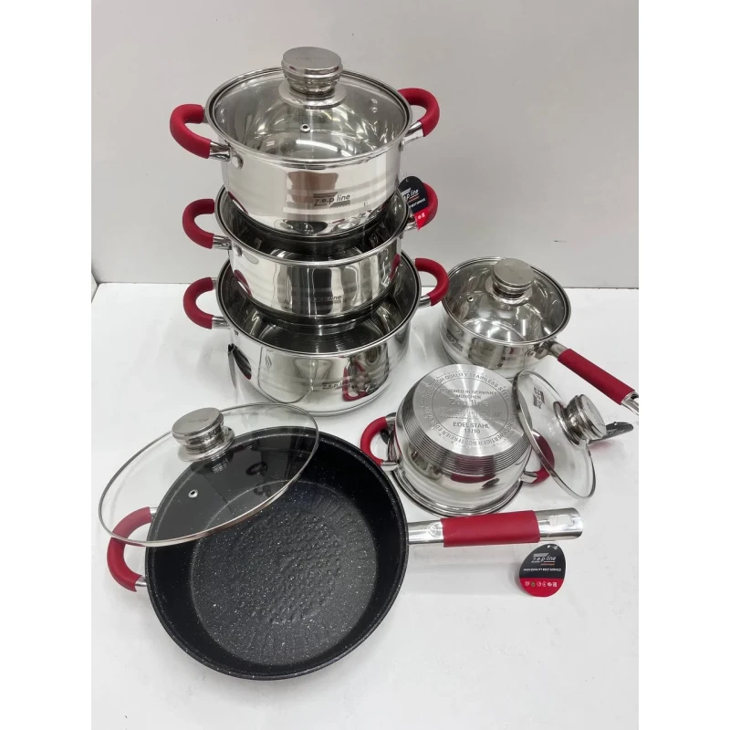 Кількість предметів в наборі 12 Каструля 4 шт. Сотейник/ківш 1 шт. Сковорода 1 шт. Матеріал Нержавіюча сталь Тип дна Багатошарове Кришки Жаростійке скло Антипригарне покриття Тільки сковорода Колір Сріблястий Тип плити Індукційна, Газова, Електрична Виробник Zepline Країна виробник Німеччина