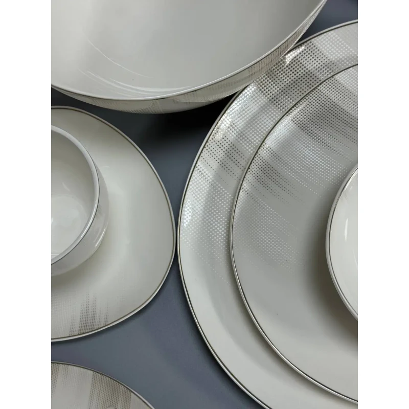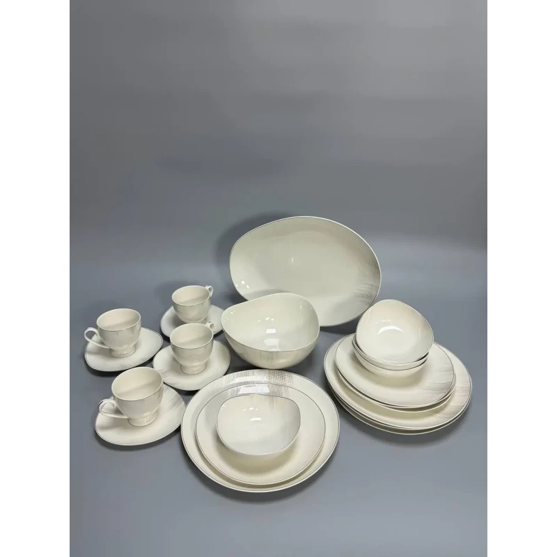 Столовий сервіз RG 1114 у слоново-кремовому відтінку створює відчуття тепла, спокою та витонченого смаку. Ніжна порцеляна м'яко відбиває світло, а делікатна срібна облямівка надає святкового шарму, роблячи кожну подачу особливою.