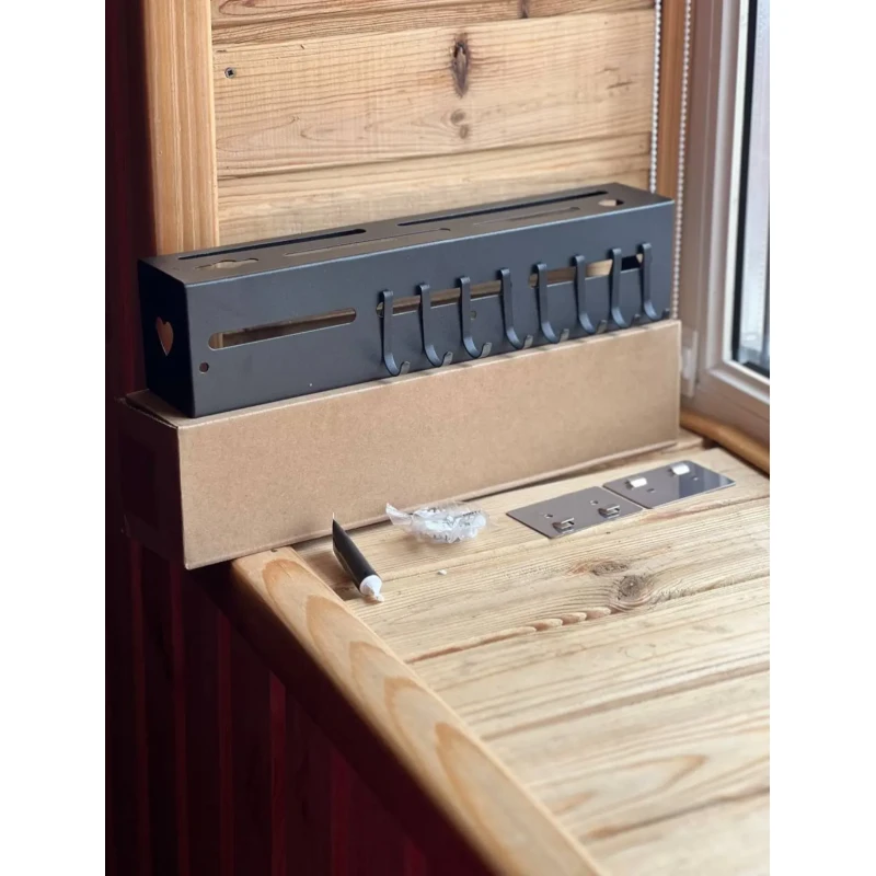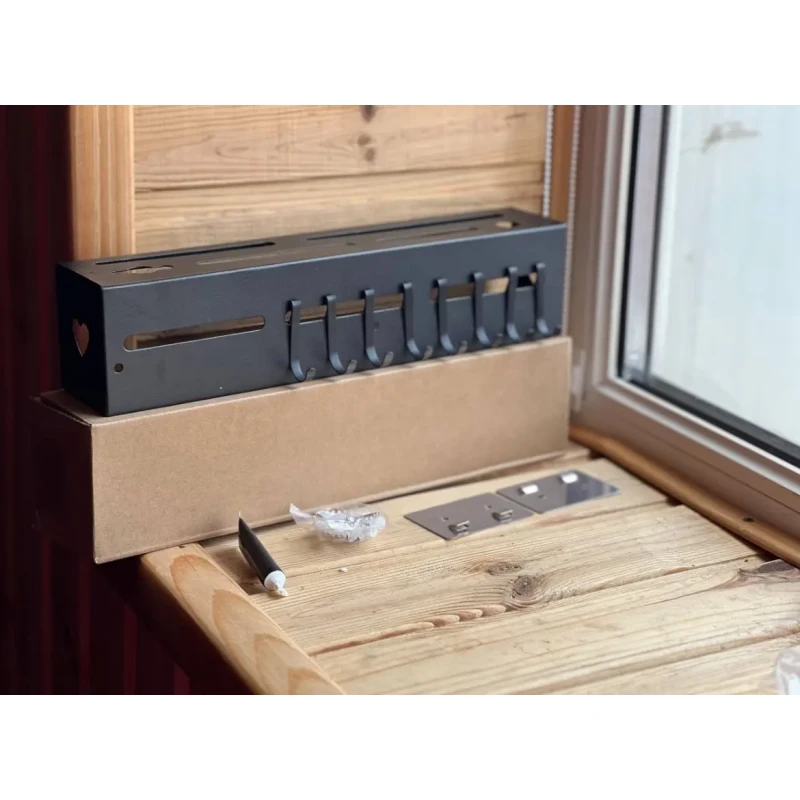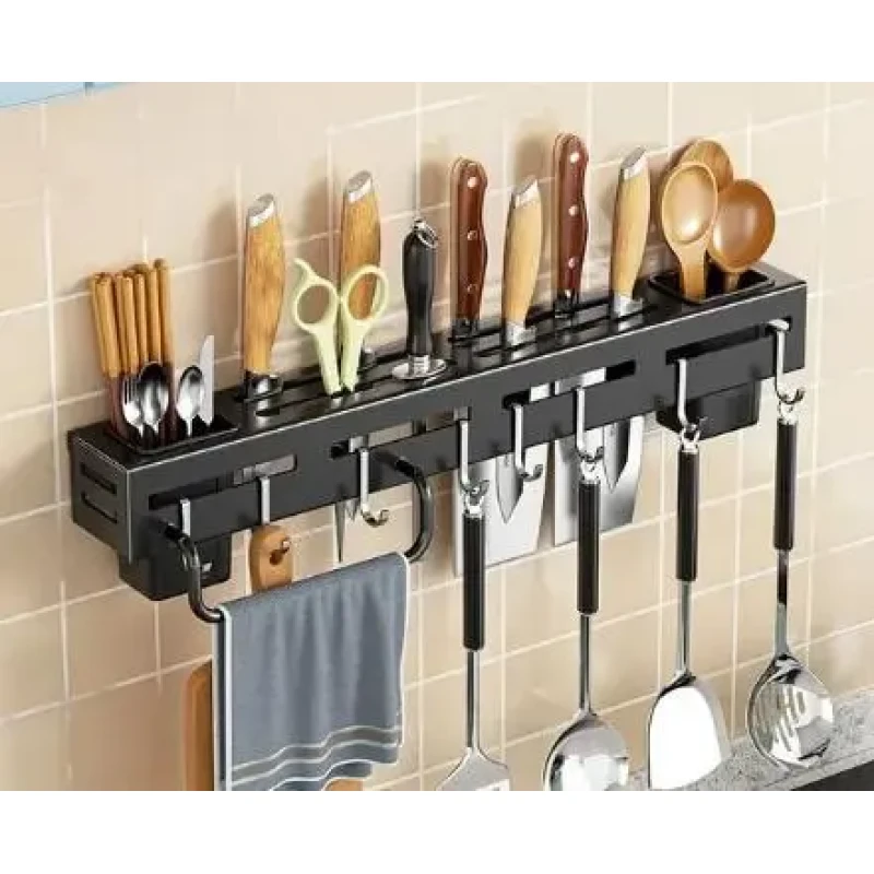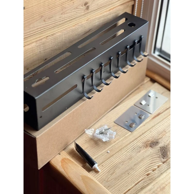 1 кухонна полиця для ножів (30 x 5,5 x 7,4 см) + 1 вішалка для рушників + 1 тримач ложки + 8 гачків + 2 гачки + гвинти. Чорний колір. Матеріал: нержавіюча сталь.