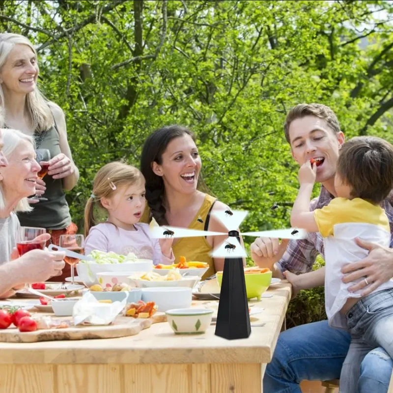 Це легкий вентилятор без запаху, який Ви розміщуєте поверх столу для пікніка або на відкритому повітрі, щоб мухи не могли пірнати бомбардуючи вашу їжу.
