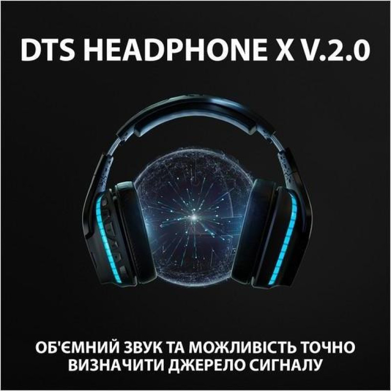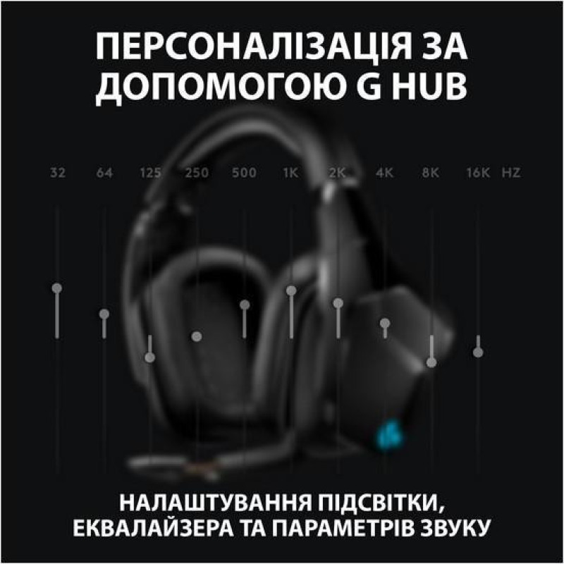 Для прийому звукового потоку, навушникам з мікрофоном Logitech G935 (L981-000744) видали режим бездротового підключення на частоті 2,4 ГГц та провідне через аналоговий mini jack 3,5 мм роз'єм. При цьому, в першому випадку модель може відпрацювати без підзарядки близько 8 годин, якщо включено підсвічування і близько 12 годин без неї. У той же час, 50 мм динаміки з комбінованого сітчастого матеріалу, мають 39 Ом опору, 93±3 дБ чутливості і охопленням частот в діапазоні 20-20000 Гц, а чаші навушників з мікрофоном Logitech G935 (L981-000744) частотним охопленням 100-10000 Гц.