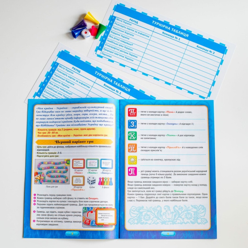 Ну що, готові до неймовірної подорожі по рідній землі? Відкрийте для себе Україну разом з настільною грою «Моя країна – Україна»! В оновленому компактному форматі – це не просто розвага, а справжній освітній досвід! Упакування оформлене в стильному українському дизайні - стане ідеальним подарунком на будь-які офіційні заходи. Ви та ваші близькі отримаєте не тільки веселощі, але й корисні знання про народну творчість та природні скарби нашої Батьківщини.