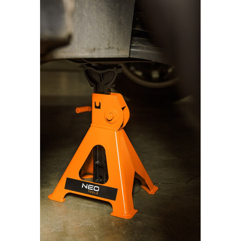 Автомобільні підставки NEO 11-750 призначені для фіксації транспортного засобу після підйому домкратом. Комплект із двох елементів має вантажопідйомність до 3 т. Діапазон регулювання висоти 290–435 мм дозволяє адаптувати положення до умов роботи. Сталева конструкція та храповий механізм забезпечують надійну фіксацію.