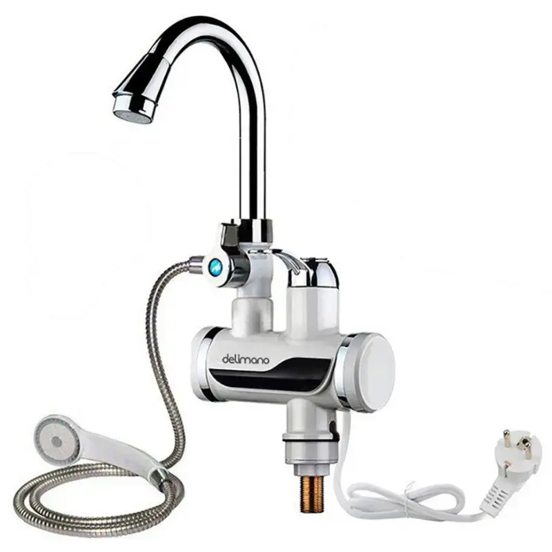 Він встановлюється замість крана та підключається до електромережі. Через кілька секунд із крана ллється гаряча вода. В електричному водонагрівачі встановлений терморегулятор, який швидко нагріває воду. Ця модель йде в комплекті з душем, тому Ви можете встановити цей комплект у ванну кімнату.