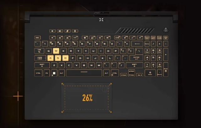 Розкладка, як у звичайних зовнішніх клавіатур, персоналізоване повнокольорове підсвічування, виділена комбінація WSAD – клавіатура ноутбука TUF Gaming спеціально оптимізована під ігри. Технологія Overstroke забезпечує прискорене спрацювання клавіш, що буде особливо корисним для чіткого керування у динамічних сценах. Відповідно до духу серії TUF, клавіатура також може похвалитися особливою довговічністю – її ресурс становить понад 20 мільйонів натискань. Вона доповнена тачпадом із збільшеною площею поверхні.