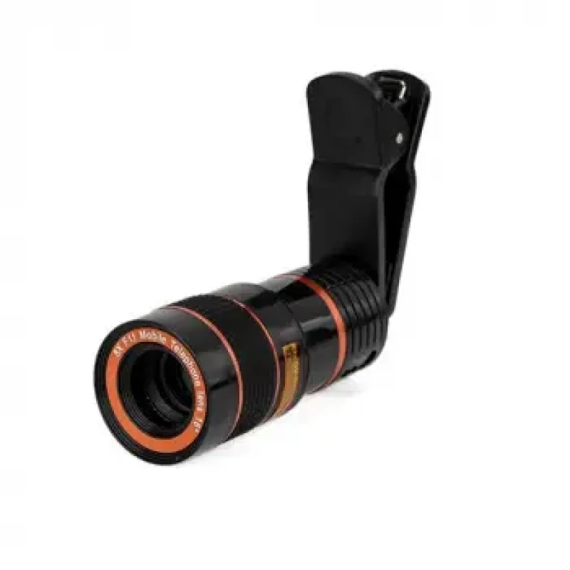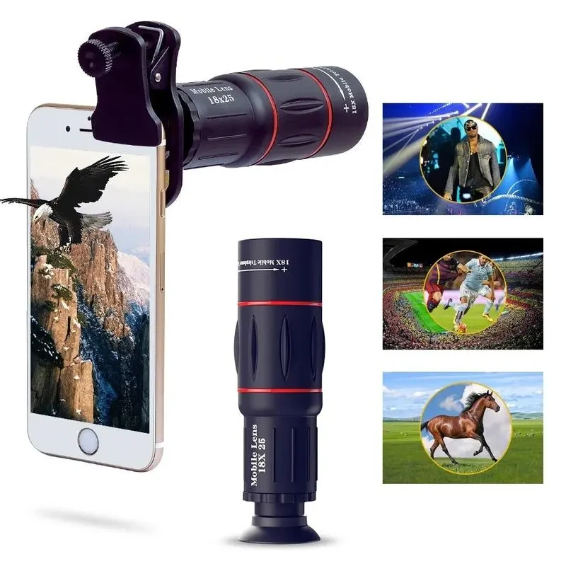 Знімний телескоп для камери вашого мобільного телефону, смартфона або навіть планшета. Це зовнішній універсальний телескоп, він миттєво перетворює ваш смартфон на справжню підзорну трубу. Повна сумісність з усіма смартфонами, iPhone (4,4s,5,5s,5c,6,6 plus,iPad), Samsung (galaxy, note,..), HTC, Nokia, Lenovo, LG, Huawei та іншими. Завдяки новому дизайну не відбувається викривлення зображення, 8-кратний оптичний зум-об'єктив дозволяє збільшувати об'єкт до 60 разів за допомогою цифрового зуму. У комплекті йде універсальний (прищіпка) або регульований тримач, сумісний з усіма мобільними телефонами та смарфонами. Відмінно підходять для зйомки високоякісних фотографій за допомогою мобільного телефону або смартфона, та й зрозуміло шикарна річ для ексклюзивних фото)