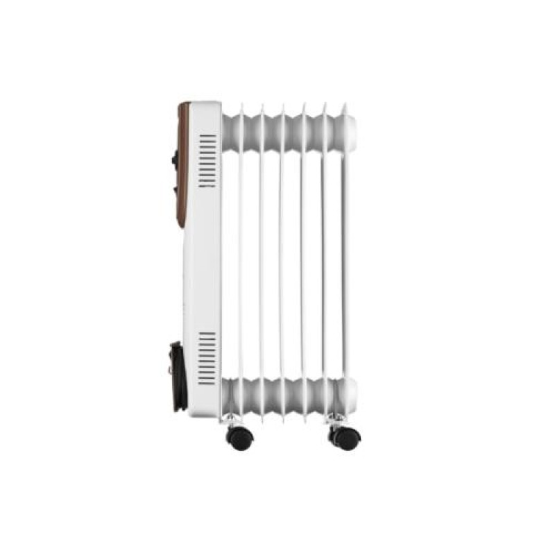 Масляний обігрівач потужністю 1500 Вт на 7 секцій і площею обігріву до 15 м2. Для пересування є коліщатка і зручна ручка, шнур живлення легко фіксується на корпусі, а для безпечного використання передбачений захист від перегріву і датчик перекидання.