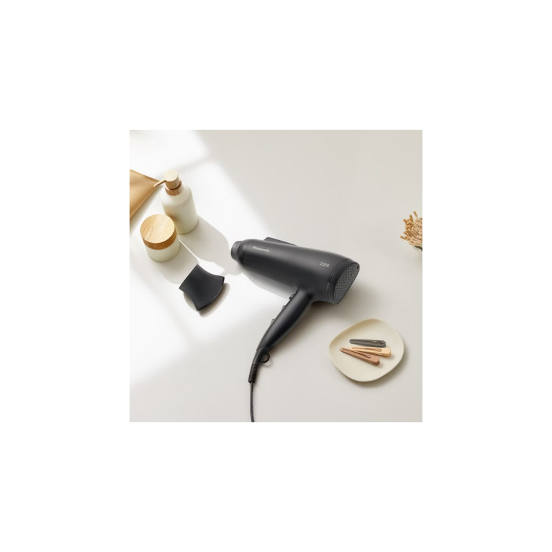 Фен Panasonic EH-NE85-K865 з потужністю 2300 Вт забезпечує швидке висушування завдяки поєднанню високого повітряного потоку та насадки Air Boost. Іонізація зменшує статичний заряд і допомагає зберегти гладкість волосся. Передбачені індивідуальні налаштування температури та швидкості, а режим холодного обдування фіксує результат укладання.