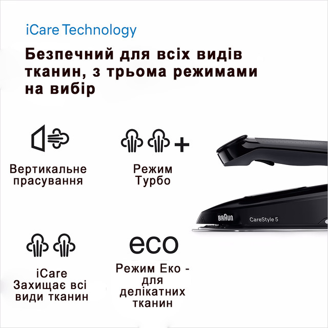 Braun CareStyle 5 пропонує повний спектр функцій для швидкого та комфортного прасування будь-яких виробів. Завдяки технології iCare температура автоматично підлаштовується під різні тканини, тому вам більше не потрібно відкладати делікатні речі. Увімкніть режим Turbo, щоб отримати максимальну потужність пари для щільного одягу, або перейдіть на ECO, щоб заощадити до 55% енергії, зберігаючи при цьому ідеальну якість видалення складок. Технологічний Braun CareStyle 5 знає підхід до різних типів тканин.