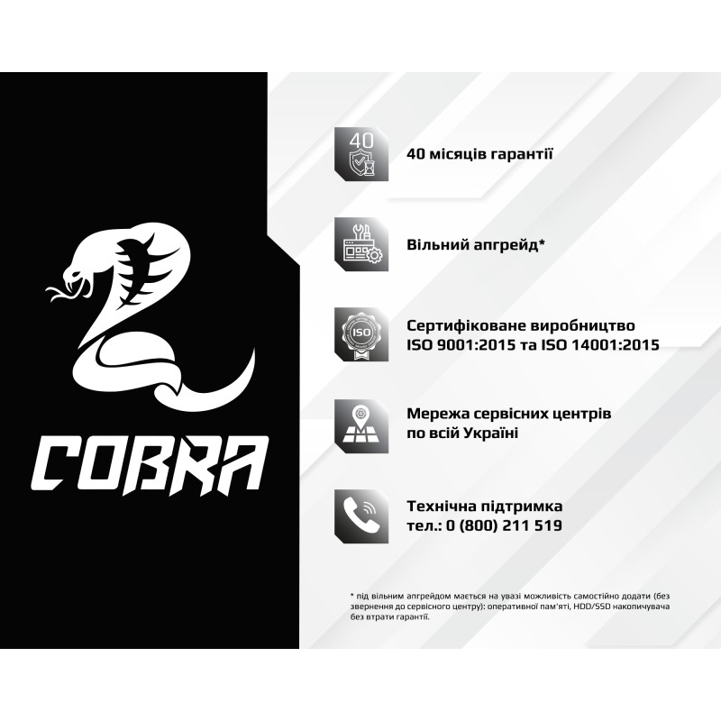 ПК COBRA збираються на базі комплектуючих визнаних світових лідерів, таких як Intel, AMD, MSI, ASUS, Zalman, ProLogix, Seagate, Toshiba, Hitachi, Transcend, Kingston і ін.