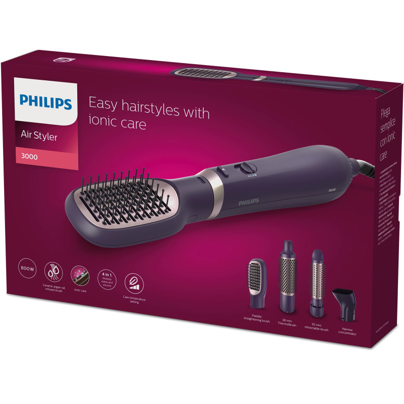 Фен-щітка Philips серії 3000 поєднує сушіння та укладання в одному пристрої, забезпечуючи м’який догляд за волоссям. Потужність 800 Вт, іонізація та керамічні пластини з аргановою олією допомагають створювати гладкі хвилі, об’єм або природно прямі зачіски вдома. Чотири насадки та гнучкі налаштування температури і швидкості дають змогу адаптувати укладання під різні типи та довжини волосся.