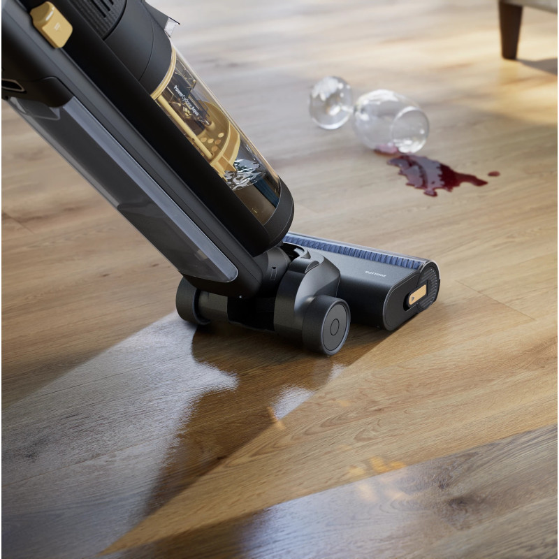 Philips Series 7000 AquaTrio — бездротовий пилосос 3-в-1 для сухого й вологого прибирання та швидкого ручного чищення. Щітки AquaSpin обертаються до 2500 об./хв і збирають сухий та вологий бруд за один прохід. PowerCyclone Aqua розділяє чисту й брудну воду, а система автоочищення промиває вузли після роботи — без ручного чищення щіток. Є насадка для сухого прибирання зі світлодіодами, гнучкий доступ під меблі та три режими для різних типів забруднень.