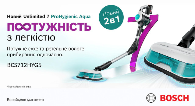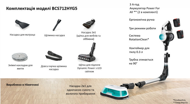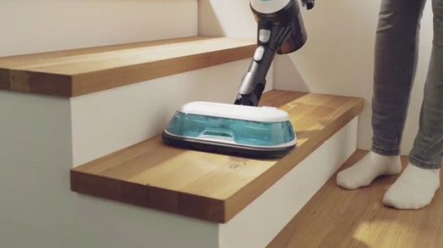 Насадка 2в1 DynamicAqua пилососить і миє підлогу одночасно: висока потужність у всмоктувальному каналі видаляє пил і залишки бруду, тоді як накладки для миття, у які постійно подається свіжа вода, витирають навіть складні плями.