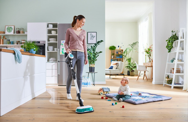 Сухе та вологе прибирання відбуваються одночасно, разом з насадкою 2в1 DynamicAqua* для сухого та вологого прибирання.