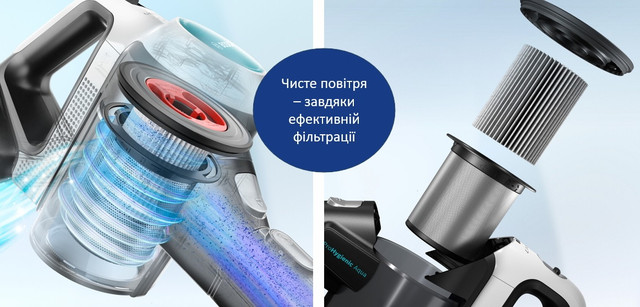 Відмінна якість повітря є надзвичайно важливою, особливо для людей, які страждають на алергії. Завдяки HEPA фільтрації, яка затримує 99,97% дрібних пилових частинок, забруднене повітря не повертається в приміщення. Комбінація різних фільтрів, ущільнювачів і циклону в пилозбірнику забезпечує, щоб відпрацьоване повітря було чистішим за звичайне повітря в домі.
