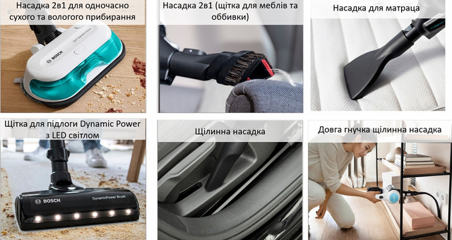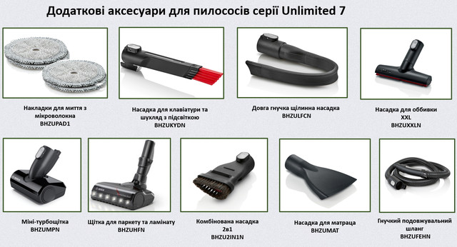 Додаткова комплектація | Насадка для паркету|Насадка-щітка для меблів|Щілева насадка |