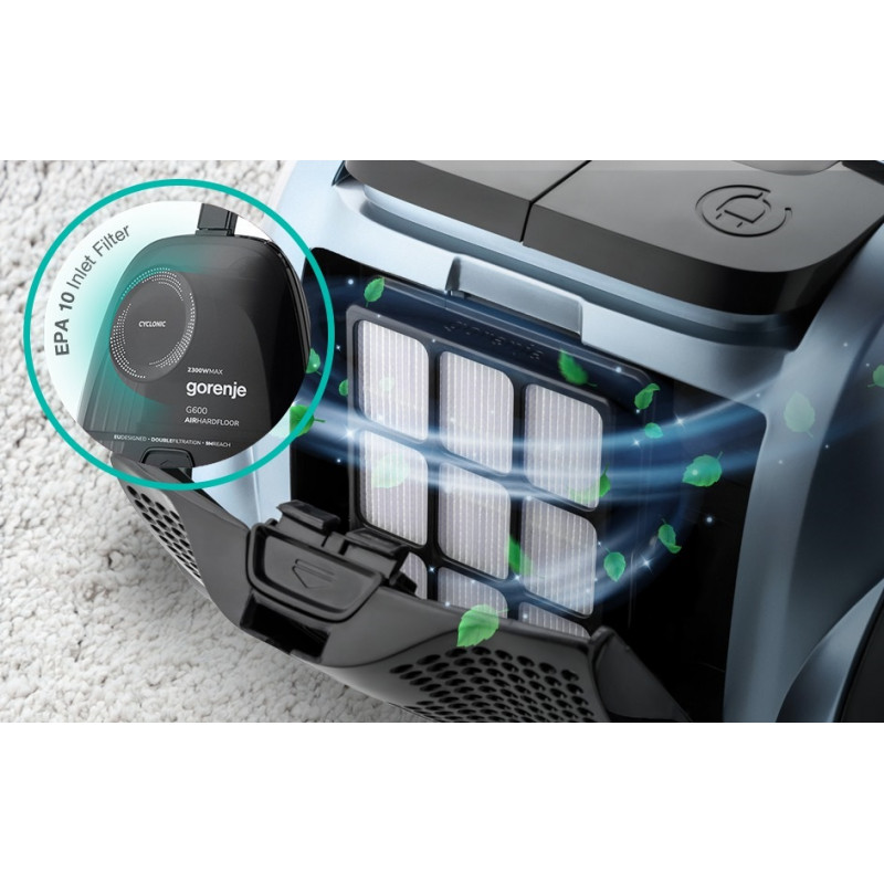 Пилосос оснащений двигуном потужністю 2300 Вт і силою всмоктування 350 Вт, що забезпечує ефективне прибирання будь-яких поверхонь. Потік повітря 33.3 л/сек гарантує високу продуктивність прибирання пилу та дрібного сміття.