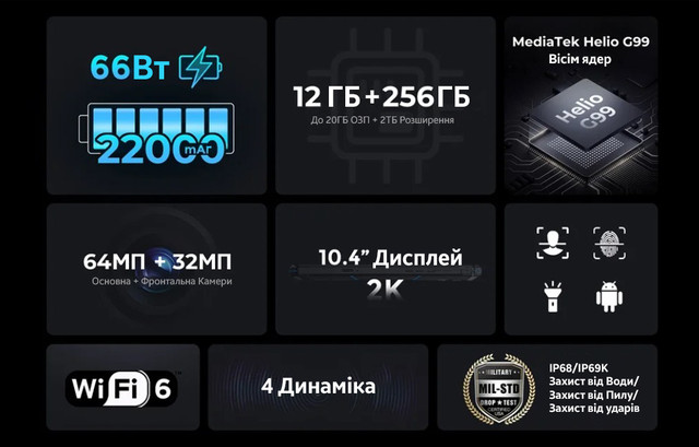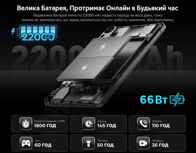 Завдяки акумулятору ємністю 22000 мАг, планшет забезпечує тривалий термін автономної роботи, а функція швидкого заряджання 66 Вт дозволяє оперативно зарядити пристрій перед важливими моментами. Таким чином, ви можете бути впевнені у стабільній та довгостроковій роботі планшета, готового до використання у будь-який момент.