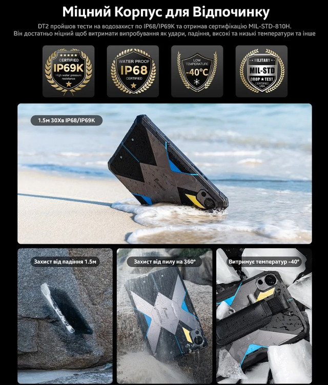 Гаджет повністю стійкий до води та пилу, відповідаючи високим стандартам IP68/IP69K, а також вимогам MIL-STD-810H. Навіть повне занурення у воду не завдасть йому шкоди.