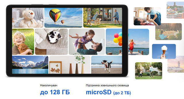 Galaxy Tab A11 легко впорається з багатозадачністю і зберіганням файлів. Версії з до 8 ГБ ОЗУ забезпечують плавну роботу додатків, а вбудоване сховище об'ємом до 128 ГБ вміщує фото, відео та документи. При необхідності пам'ять можна розширити до 2 ТБ за допомогою карти microSD.
