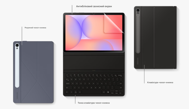 Galaxy Galaxy Tab S10 Lite відмінно працює з різними аксесуарами для планшетів, зокрема: обкладинкою-клавіатурою Book Cover, тонкою обкладинкою-клавіатурою Book Cover, обкладинкою Smart Book Cover та антивідблисковою плівкою Screen Protector. Ці сумісні рішення допомагають зручно друкувати, переглядати контент без потреби тримати планшет у руках і захищати екран із додатковою чіткістю – ви легко персоналізуєте планшет під свої потреби.