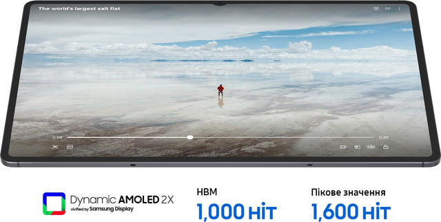11-дюймовий екран Dynamic AMOLED 2X з роздільною здатністю WQXGA (2560x1600) і частотою оновлення 120 Гц забезпечує живе і насичене зображення навіть при яскравому сонячному світлі. Покращена яскравість і точна передача кольорів роблять перегляд фільмів, ігор і мультимедіа неймовірно захоплюючим, а легкий і тонкий корпус планшета дозволяє брати його з собою куди завгодно.