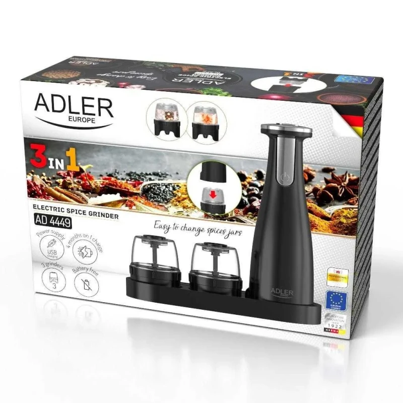 Регулювання тонкості помелу Так Підсвітка під час помелу Є Місткість подрібнювача 150 мл Основа Велика хромована кнопка для зручності використання Корпус АБС-пластик Індикатор заряджання Є Система швидкої зміни контейнерів Встановлення, натискання й дозування Автоматичне вимкнення Через 3 хвилини Час роботи при повному заряді До 120 хвилин безперервної роботи Час роботи за повного заряджання До 4 місяців Час заряджання 2,5 години Кількість змінних контейнерів 3 Перезарядка через USB Type-C Так Акумулятор Літій-іонний, 1500 мАгод Джерело живлення DC3,7 В ~ 1,5 А, 7 Вт Комплектація База, 3 змінні подрібнюючі контейнери, лоток, USB-кабель Розміри пристрою (ВхШхГ) 26,3 см (висота), 8 см (ширина), 8 см (глибина) Розміри підносу 24,8 см (ширина), 9,5 см (глибина), 2,5 см (висота) Подрібнювач спецій Adler AD 4449 Black це стильний та зручний прилад, який дозволяє швидко та ефективно подрібнювати спеції. Завдяки акумулятору, що забезпечує до 120 хвилин роботи безперервно, цей подрібнювач стане незамінним помічником на кухні. Час зарядки становить лише 2,5 години, що дозволяє швидко відновити його працездатність. Модель оснащена трьома змінними контейнерами, кожен з яких має місткість 150 мл, для різноманітних спецій. Контейнери легко змінюються завдяки системі швидкої зміни, що дозволяє швидко переключатися між різними спеціями. Подрібнювач також оснащений великою хромованою кнопкою для зручності використання та LED підсвіткою, що робить процес помелу ще більш комфортним. Цей пристрій має регулювання тонкості помелу, що дозволяє вибирати ідеальну консистенцію для кожної спеції. Завдяки літій-іонному акумулятору ємністю 1500 мАгод, подрібнювач працює до 4 місяців на одному заряді, що робить його дуже економічним у використанні. Індикатор заряджання допомагає відслідковувати рівень заряду, а автоматичне вимкнення через 3 хвилини після використання гарантує економне використання енергії. В комплекті з подрібнювачем йде USB-кабель для зручної зарядки через порт USB Type-C. Розміри пристрою: 26,3 см у висоту, 8 см в ширину, що дозволяє легко зберігати його на кухні.
