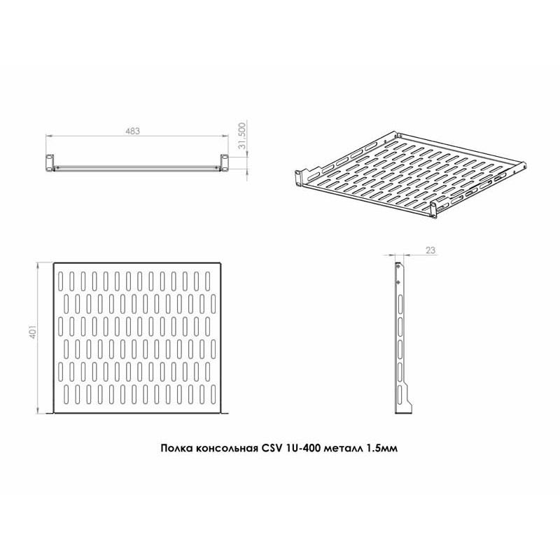 Консольна полку призначена для розташування необхідного обладнання та аксесуарів всередині 19 "конструктиву. Модель сумісна з усіма шафами і стійками CSV.