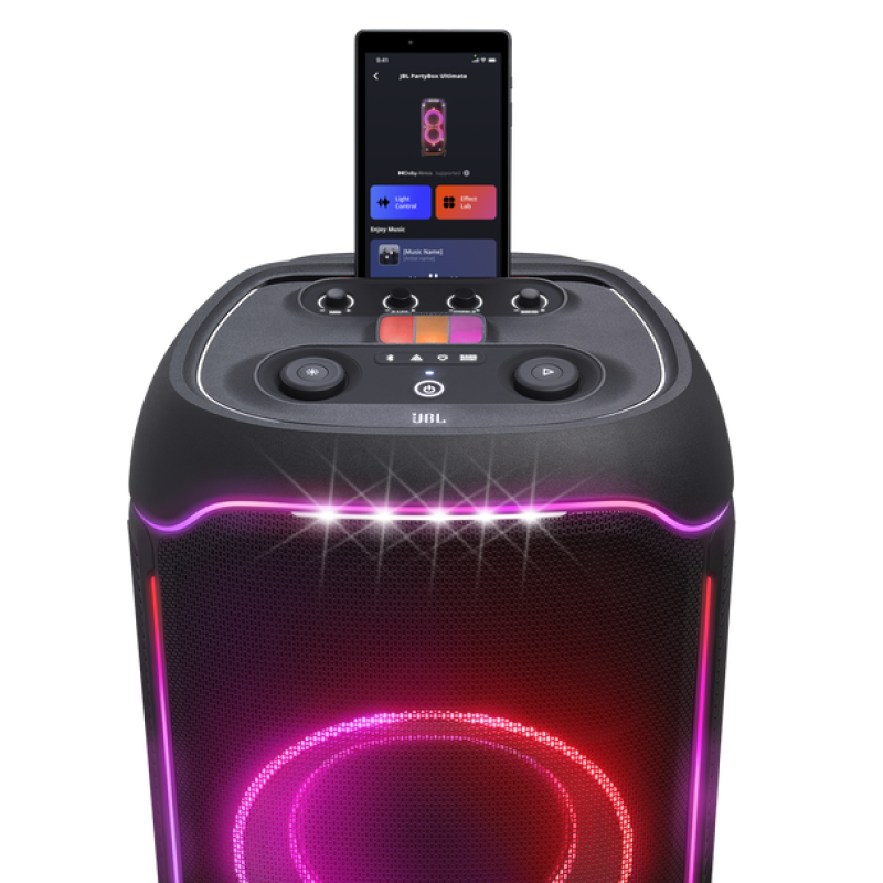 Багатовимірне динамічне світлове шоу. Світло, колір, вечірка! Перетворіть свій простір на захоплюючий, повний сенсорний досвід за допомогою найбільшого багатовимірного світлового шоу серед усіх спікерів вечірки. Він має унікальний ефект зоряної ночі, круті світлові шлейфи, стробоскопи та навіть світло, яке проектується на будь-яку поверхню, на якій він стоїть. Усе це синхронізується з вашою музикою, і ним можна легко керувати за допомогою обтічних, зручних дисків на верхній панелі або через додаток JBL One.