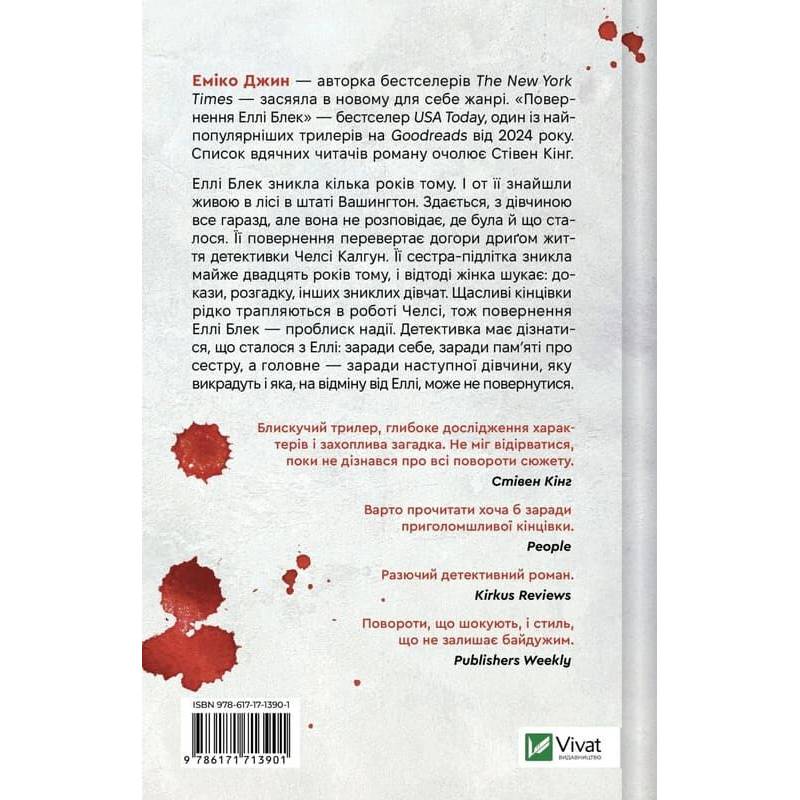 Книга «Повернення Еллі Блек» — це психологічний трилер про справи зниклих безвісти та одну вцілілу жертву, створений американською письменницею японського походження Еміко Джин. З повільним наростанням напруги авторка розповідає похмуру історію про відновлення після травми. Сімнадцятирічна Еллі Блек залишає вечірку в пошуках вбиральні й просто розчиняється в повітрі! За два роки заблукалу дівчину знаходять у лісі, та видається, що від зниклої залишилася тільки частина колишньої сутності.