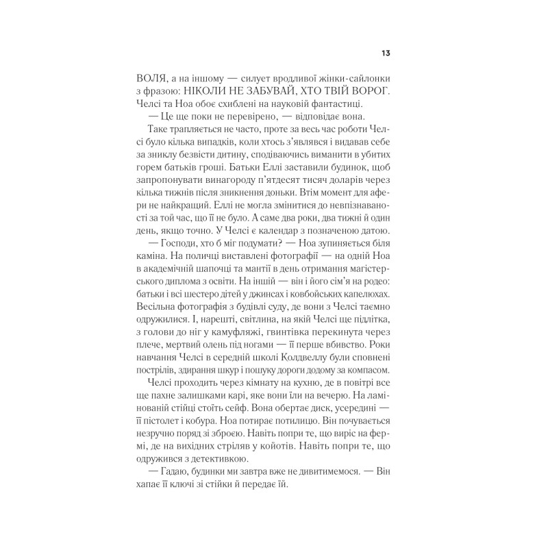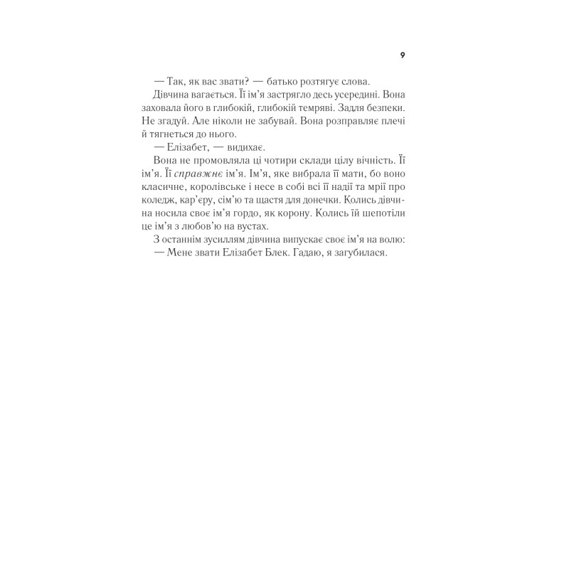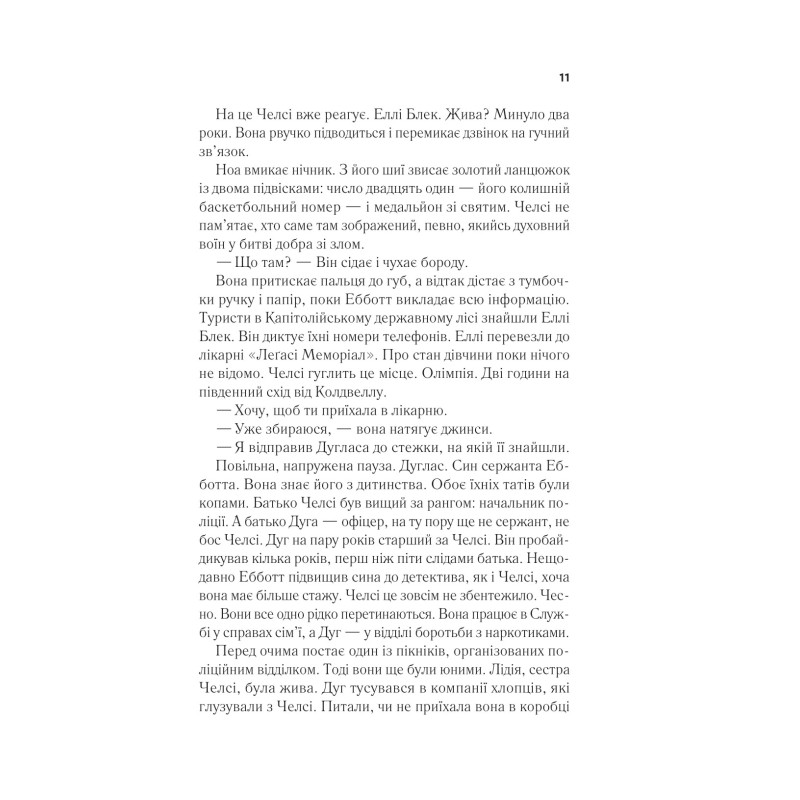 Анотація: Еллі Блек зникла кілька років тому. І от її знайшли живою в лісі в штаті Вашингтон. Здається, з дівчиною все гаразд, але вона не розповідає, де була й що сталося. Її повернення перевертає догори дриґом життя детективки Челсі Калгун. Її сестра-підлітка зникла майже двадцять років тому, і відтоді жінка шукає: докази, розгадку, інших зниклих дівчат. Щасливі кінцівки рідко трапляються в роботі Челсі, тож повернення Еллі Блек — проблиск надії. Детективка має дізнатися, що сталося з Еллі: заради себе, заради пам’яті про сестру, а головне — заради наступної дівчини, яку викрадуть і яка, на відміну від Еллі, може не повернутися.