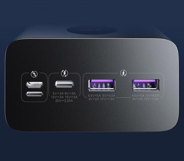 На торці користувач знайде панель слотів з доступом до всіх інтерфейсів. USB-A представлені окремими портами на вхід (один) і вихід (пара), тоді як USB Type-C поєднав у собі обидві функції. Заряджайте одночасно до 3 пристроїв, не витрачаючи часу на очікування.