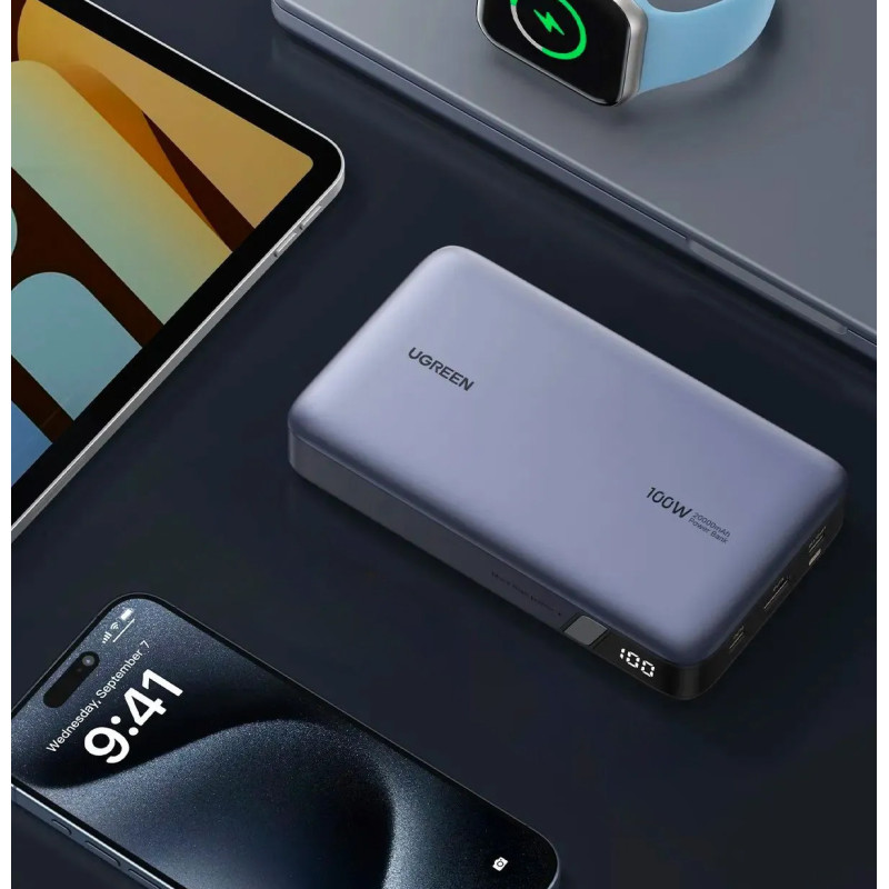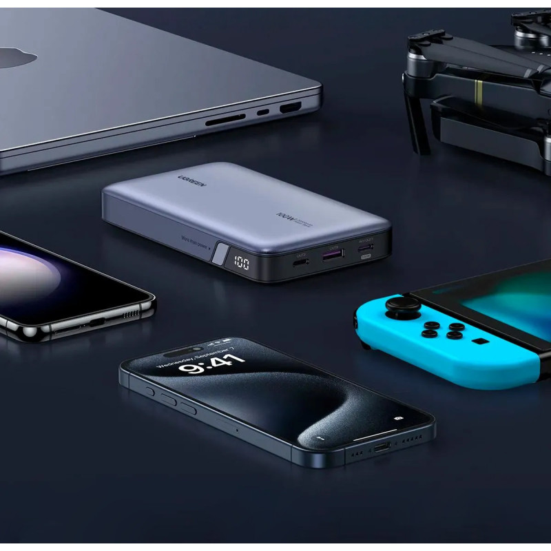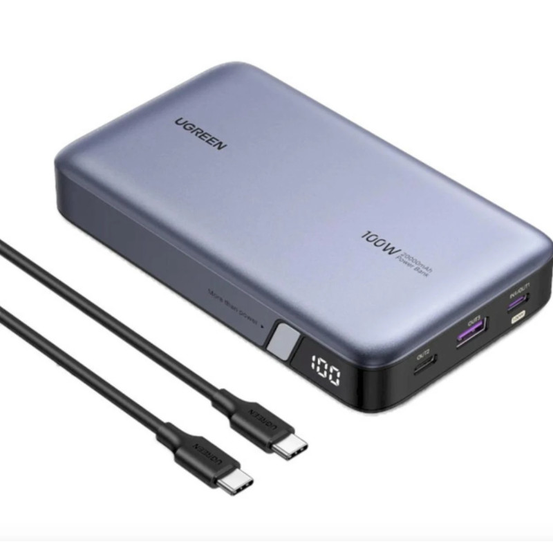 Ugreen PB720 оснащений двома портами USB-C (100 Вт і 30 Вт) та USB-A 22,5 Вт, що дозволяє одночасно заряджати до трьох пристроїв — від ноутбука до смартфона чи аксесуарів. Порт USB-C підтримує вхідну потужність 65 Вт, завдяки чому сам павербанк повністю заряджається приблизно за 2 години. Ємність 20 000 мА·год забезпечує кілька днів автономності, а цифровий LED-дисплей точно відображає залишок заряду.
