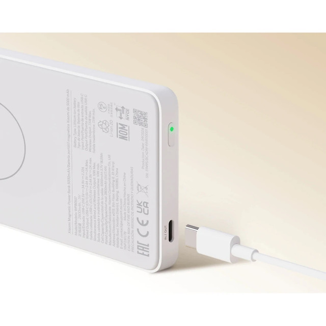 Powerbank XIAOMI 5000mAh Magnetic White (BHR9303GL) поєднує сучасний мінімалізм і зручність. Розміри 103.7 × 68.3 × 12 мм і легкий пластиковий корпус роблять його ідеальним для використання в дорозі та вдома. Білий колір підкреслює витончений зовнішній вигляд.