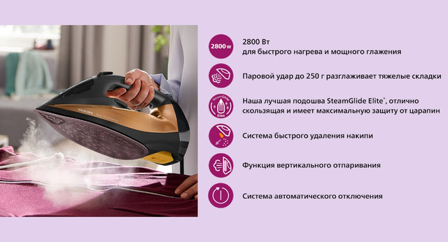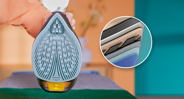 Праска плавно ковзає по складках завдяки надгладкій підошві SteamGlide Elite, яка з обережністю дбатиме про ваш одяг. Наша підошва міцна, довговічна, стійка до подряпин і легко чиститься.