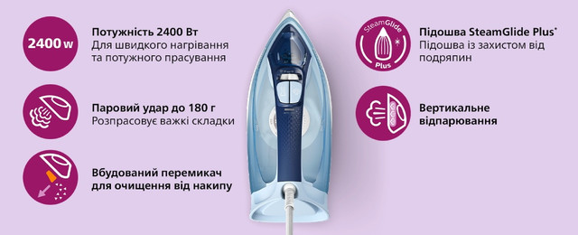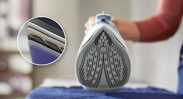 Наша спеціальна підошва SteamGlide Plus легко ковзає по будь-якій тканині. Вона також має антипригарне покриття, захист від подряпин та легко чиститься.