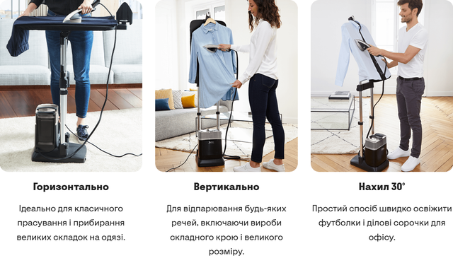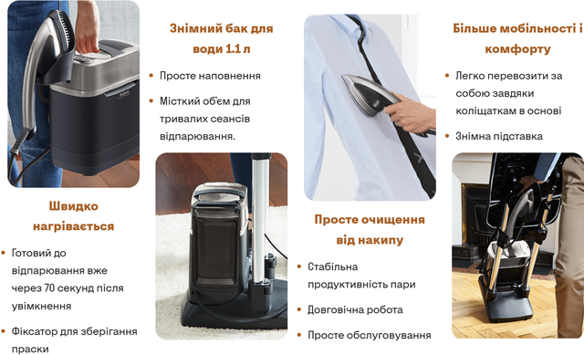 - 3 режими потужності пари: від швидкого щоденного прасування і миттєвого прибирання складок