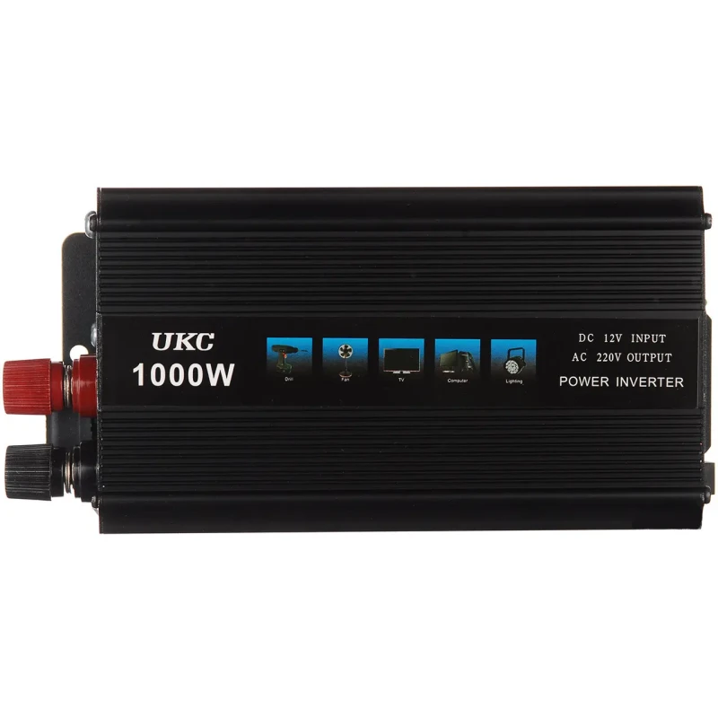 Перетворювач напруги / інвертор 12-220V UKC AC/DC 1000W SSK Перетворювач напруги, який ви можете використовувати як в автомобілі постійно так і встановити стаціонарно. Збалансована потужність та низький струм холостого навантаження. Забезпечить роботу більшості електроприладів та деяких електроінструментів. Має захист від навантаження, температурний захист, захист від короткого замикання. Ви можете встановити цей перетворювач самостійно, проте рекомендуємо звернутися до професіоналів для правильного вибору потужності акумуляторів та установки. Перетворювач напруги здійснює перетворення постійної вхідної напруги DC 12В змінну напругу AV 220B. Формою вихідного сигналу є синусоїда із частотою 50Гц.